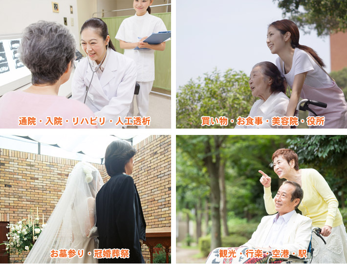 介護タクシーとは、車イスや寝台ごとご利用できるタクシーで、公共交通機関のご利用に不安をお持ちの方を対象に、どのような目的にもご利用可能な完全予約制のタクシーです。